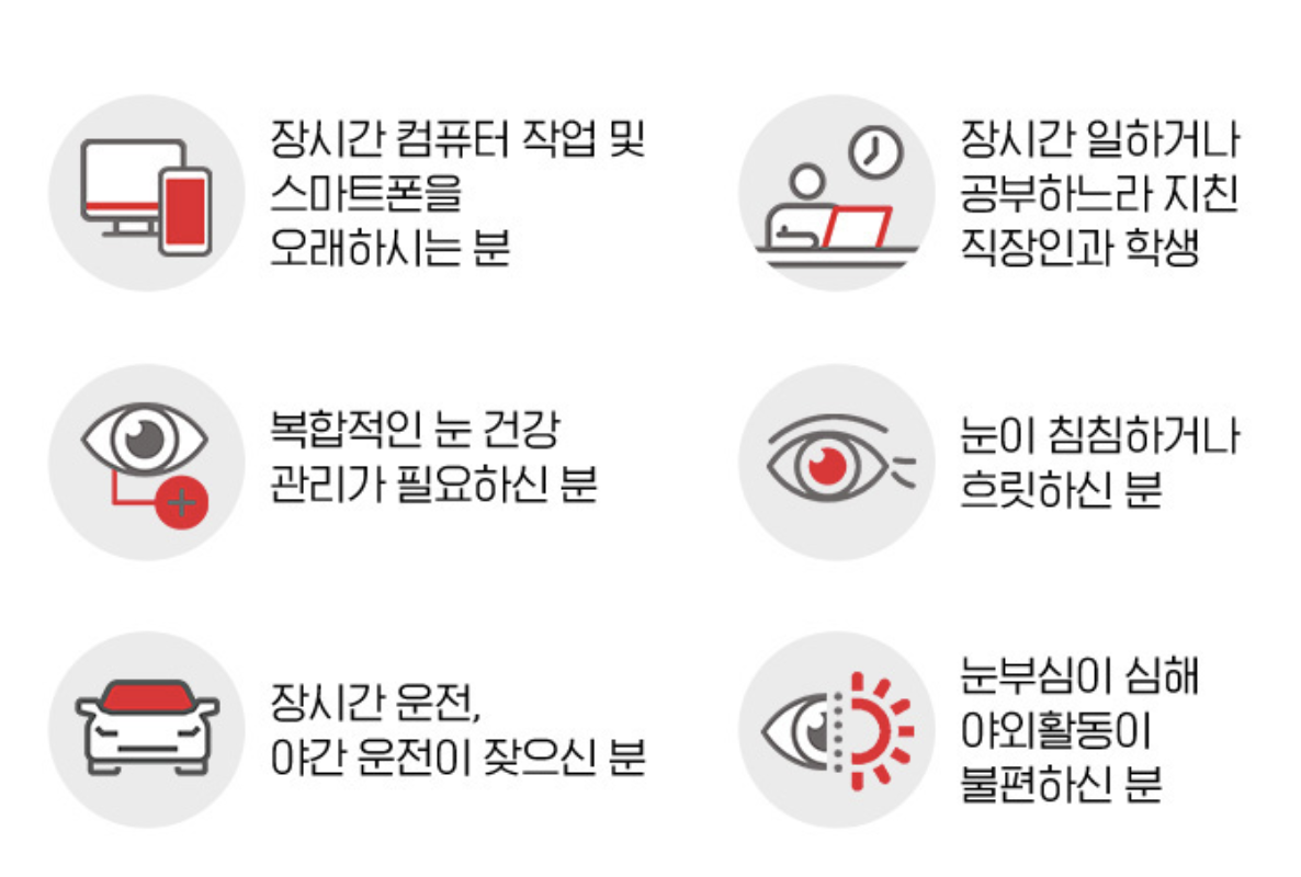 이런 영양제는 오랜시간 눈을 뜨고 작업하는 대상에게 좋습니다. 컴퓨터나 스마트폰 운전 등 눈의 피로를 덜어주기 때문에 효과를 볼수 있는 아스타잔틴 성분이 있고 식약처 권장량을 준수 해야합니다.